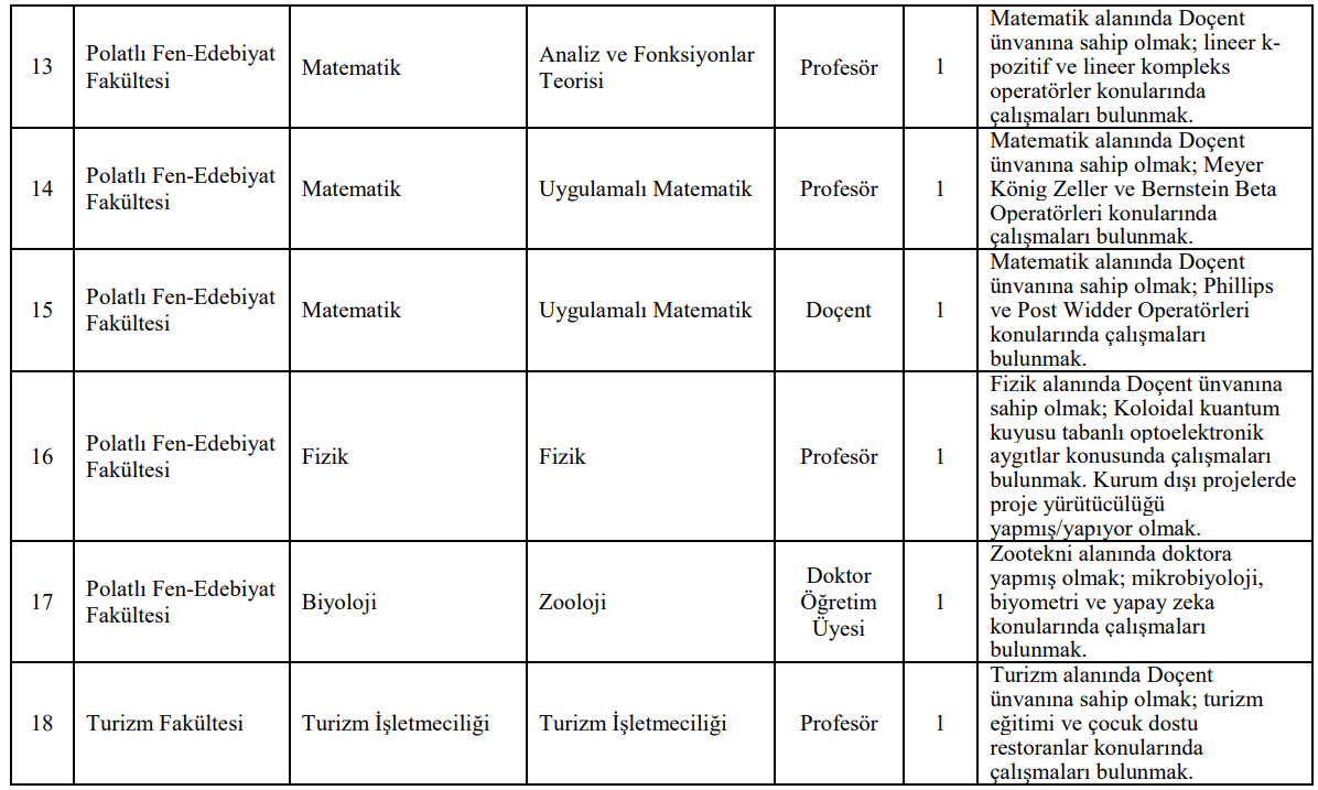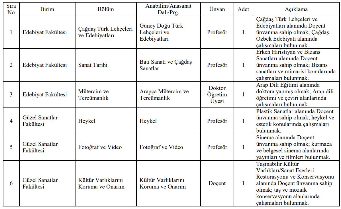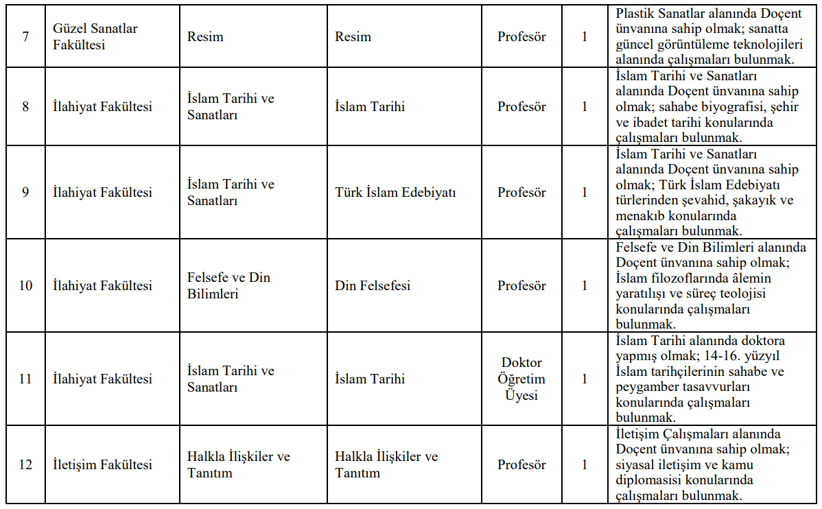 İlanda dikkat çeken fakülte ve bölüm kadrolarından bazıları şu şekilde: