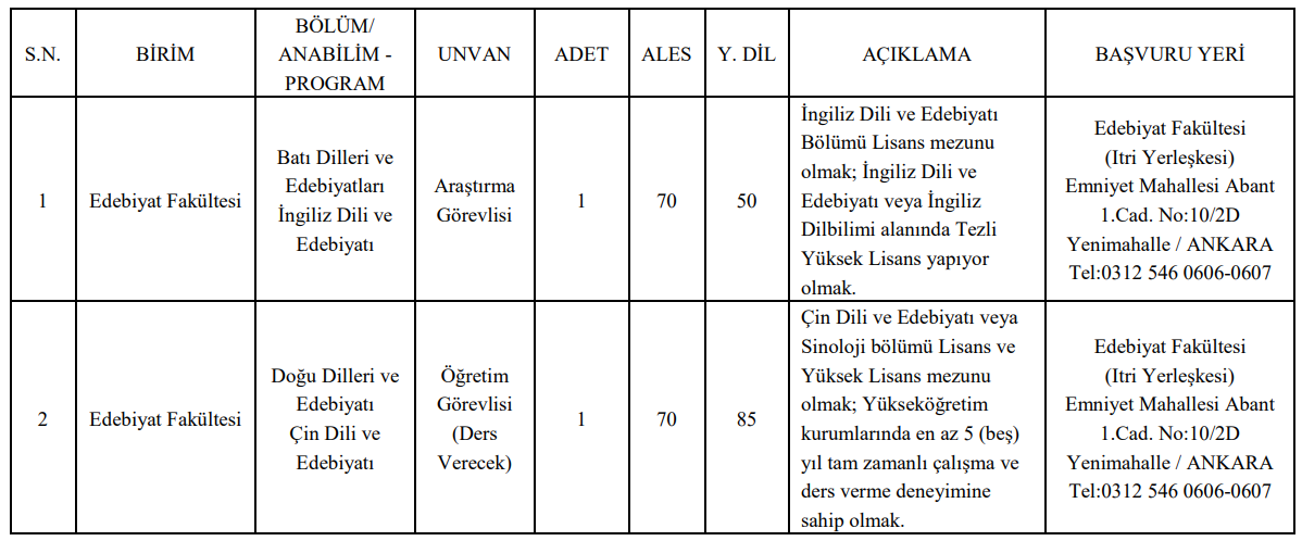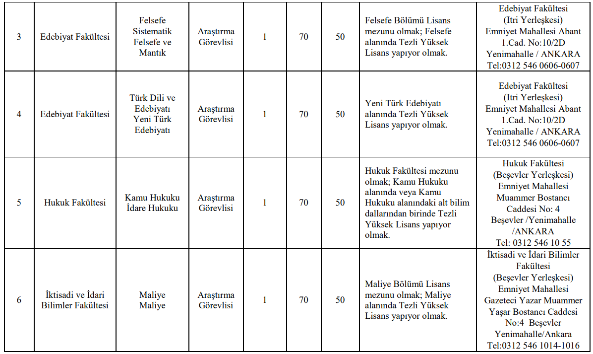 Üniversite, öğretim üyesi dışındaki kadrolar için de ilan yayımladı. Araştırma görevlisi ve öğretim görevlisi alımlarında adaylardan; ALES, yabancı dil puanı, lisans ve yüksek lisans diplomaları, transkript, özgeçmiş ve adli sicil belgesi talep ediliyor. Ayrıca öğretim görevlisi başvurularında en az beş yıl ders verme deneyimi gibi ek şartlar da aranıyor.