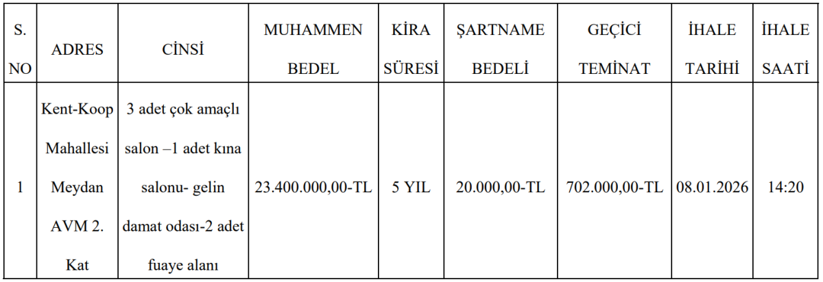 Ankara İli Yenimahalle Belediye Başkanlığı, mülkiyeti belediyeye ait olan ve Batıkent’te yer alan Meydan AVM içerisindeki çok amaçlı salonları kiraya vermek üzere ihale düzenleyeceğini duyurdu. Resmî ilan kapsamında, Kent Koop Mahallesi 61004 ada 2 parselde bulunan Meydan AVM’nin 2. katında yer alan taşınmazlar, 2886 sayılı Devlet İhale Kanunu’nun 36. maddesi uyarınca kapalı teklif usulü ile kiraya çıkarılacak.