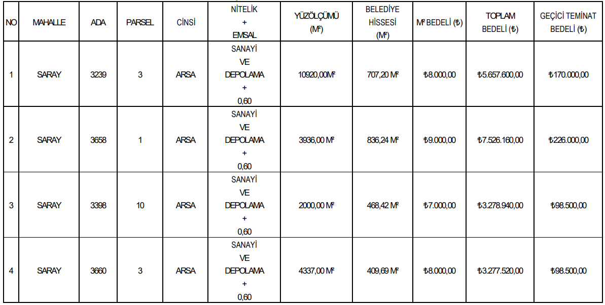 Satışa sunulan taşınmazların tamamı Saray Mahallesi’nde bulunuyor. Arsaların yüzölçümü, belediye hissesi, metrekare bedeli ve toplam satış bedelleri farklılık gösteriyor.