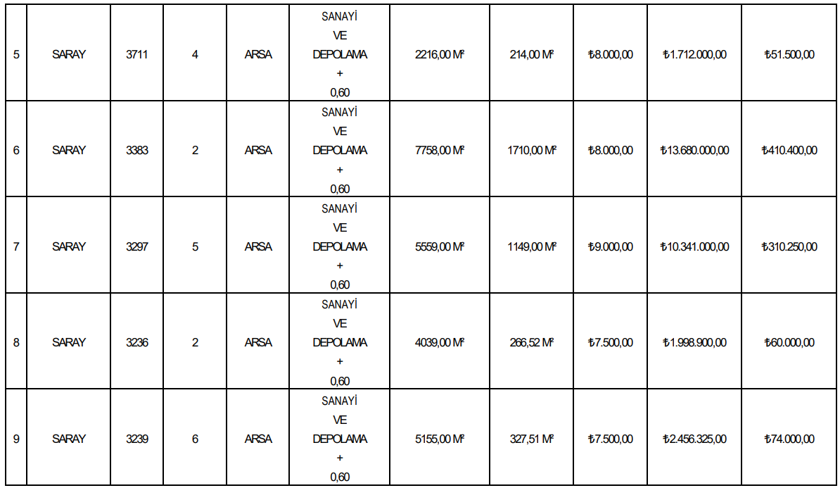 Satışa çıkarılan tüm taşınmazlar “arsa” cinsinde ve sanayi ile depolama alanı imar fonksiyonuna sahip. Emsal değeri +0,60 olarak belirtilen arsalar, üretim, lojistik ve depolama faaliyetleri açısından yatırım potansiyeli taşıyor.