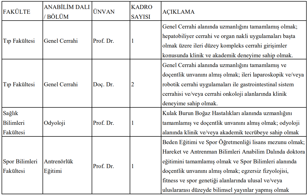Profesör kadrosuna başvuracak adayların, Genel Cerrahi alanında uzmanlığını tamamlamış olmaları ve özellikle hepatobiliyer cerrahi ile organ nakli uygulamaları başta olmak üzere ileri düzey kompleks cerrahi girişimler konusunda klinik ve akademik deneyime sahip olmaları gerekiyor.