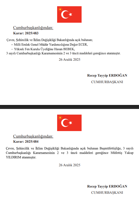 Cumhurbaşkanlığı tarafından alınan yeni atama kararları, 27 Aralık 2025 tarihli Resmî Gazete’de yayımlanarak yürürlüğe girdi. 2025/483 ve 2025/484 sayılı Cumhurbaşkanlığı Kararları ile Çevre, Şehircilik ve İklim Değişikliği Bakanlığında açık bulunan kritik görevlere yeni atamalar yapıldı. Cumhurbaşkanı Recep Tayyip Erdoğan’ın imzasını taşıyan kararlar kapsamında, bakanlık bünyesindeki genel müdür yardımcılığı, kurul üyeliği ve başmüfettişlik görevlerine yeni isimler getirildi.