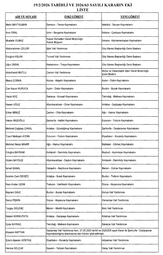 20 Şubat 2026 tarihli Resmî Gazete’de yayımlanan 2026/63 sayılı Cumhurbaşkanlığı Kararı ile mülki idare teşkilatında kapsamlı bir atama ve görev değişikliği gerçekleştirildi. Karar, 3 sayılı Cumhurbaşkanlığı Kararnamesi’nin 2’nci maddesi gereğince alındı ve 19 Şubat 2026 tarihinde imzalandı.