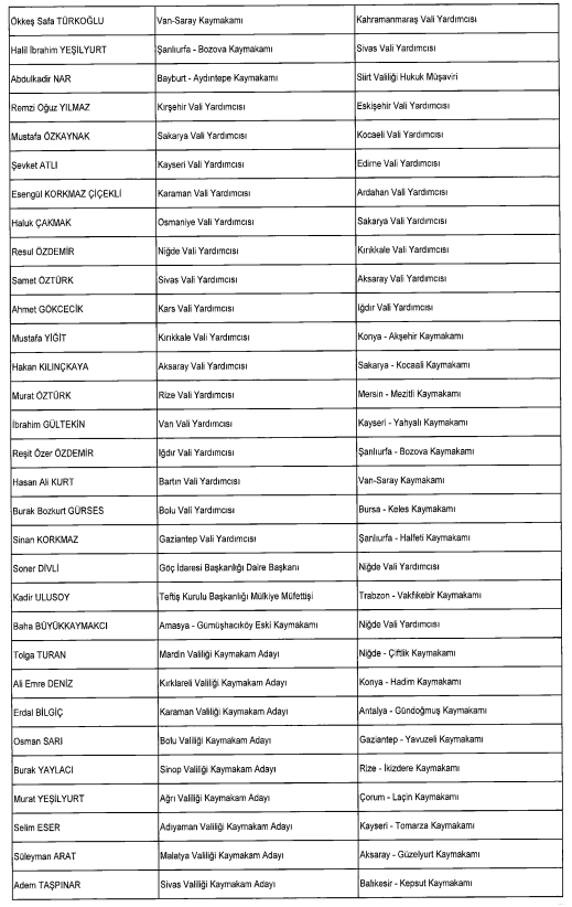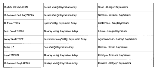 Örneğin; Samsun-Terme Kaymakamı Metin Maytalman İzmir-Bergama Kaymakamlığına atanırken, İstanbul Sarıyer Kaymakamı Avni Oral Ankara-Çankaya Kaymakamlığı görevine getirildi. Ankara-Kahramankazan Kaymakamı Mustafa Yılmaz ise Iğdır Vali Yardımcılığı görevine atandı.