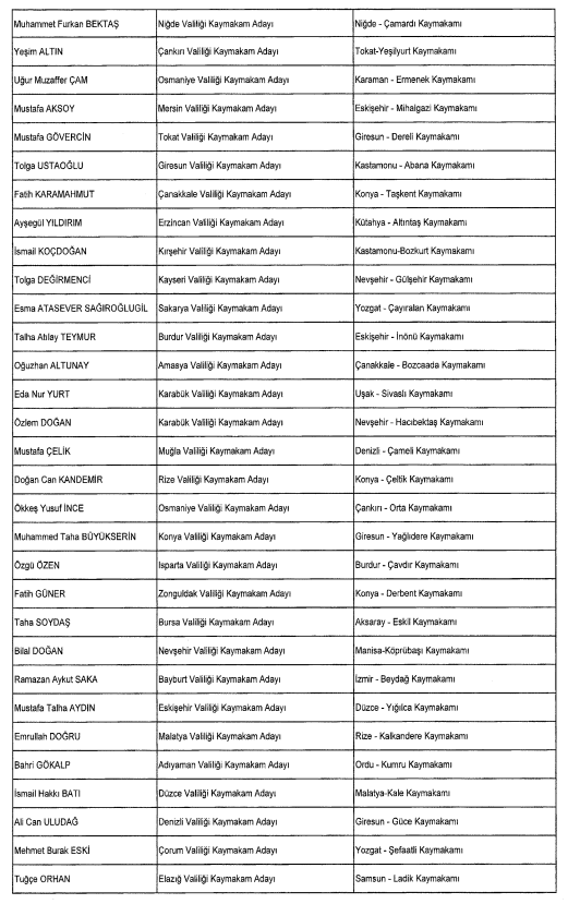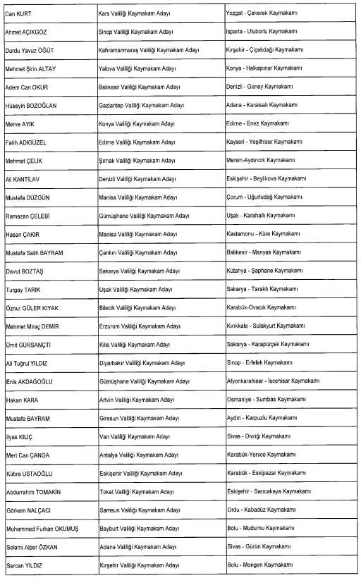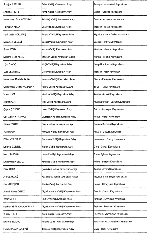 Karar listesinde çok sayıda kaymakam adayının da yeni görev yerleri yer aldı. Kars, Sinop, Kahramanmaraş, Yalova, Balıkesir, Gaziantep, Konya, Edirne, Şırnak, Denizli, Manisa, Gümüşhane, Sakarya, Uşak, Erzurum, Kilis, Diyarbakır, Artvin, Giresun, Van, Antalya, Tokat, Bayburt, Adana, Hatay, Nevşehir, Mersin ve daha birçok ilde kaymakam adaylarının görevlendirildiği görüldü.