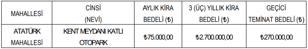 İhale şartnamesinde yer alan bilgilere göre, katlı otopark için belirlenen kira bedelleri şu şekilde açıklandı: