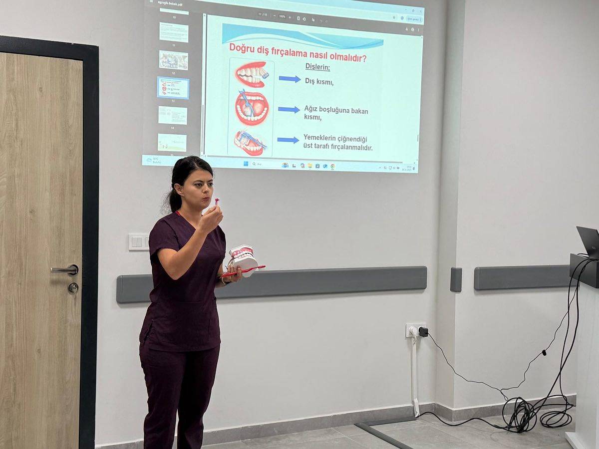 Çocuklarda diş fırçalama alışkanlığının ne zaman başlaması gerektiği, hangi tür diş macunlarının kullanılabileceği ve diş hekimi kontrollerinin hangi aralıklarla yapılmasının uygun olduğu eğitimde vurgulanan noktalar arasında yer aldı.