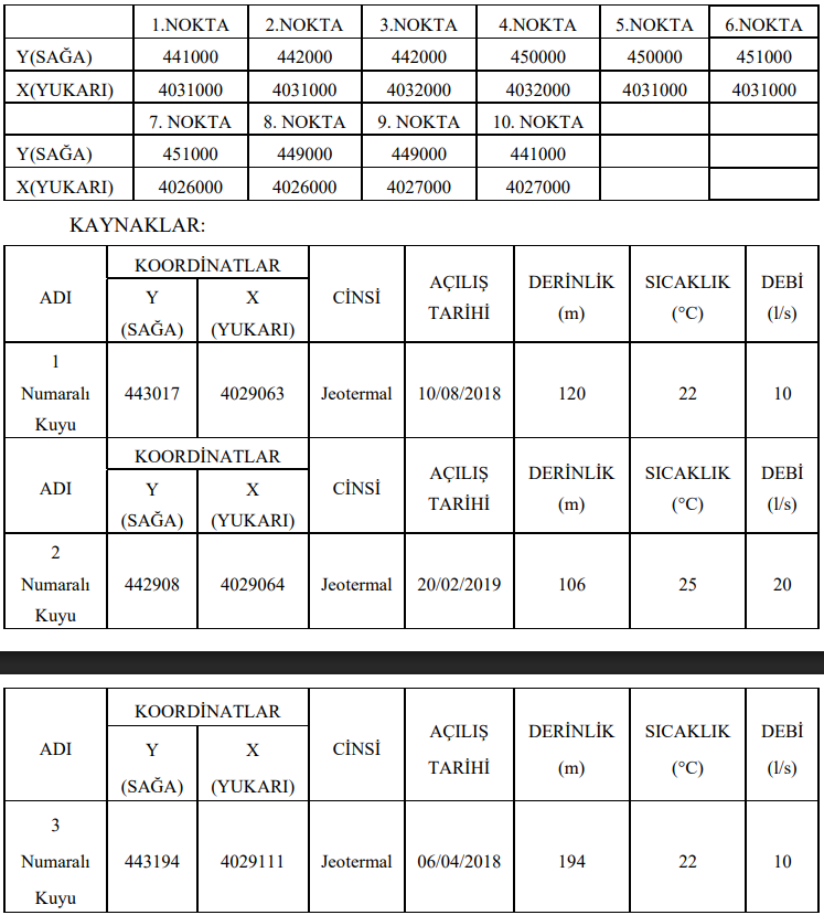 İhale kapsamındaki işletme sahasında üç adet jeotermal kuyu yer alıyor. Kuyuların teknik özellikleri ise şöyle açıklandı: