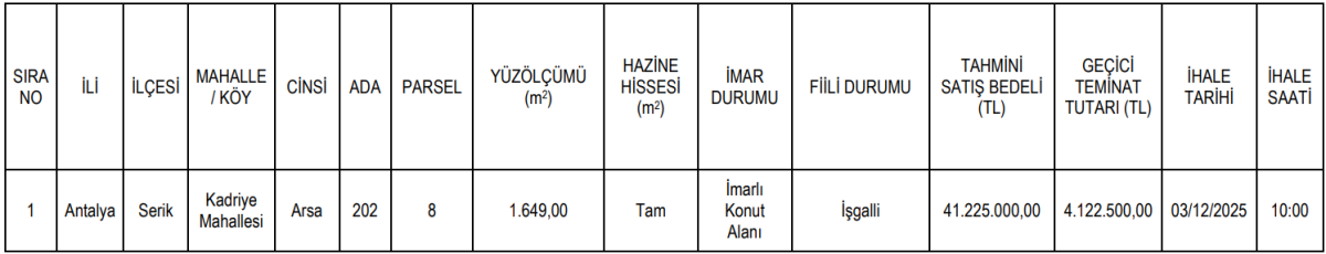 İhale, 03 Aralık 2025 tarihinde saat 10.00’da Serik Kaymakamlığı Toplantı Salonu’nda yapılacak. Taşınmazın konut alanı imarlı ve işgalli durumda olduğu bildirildi.