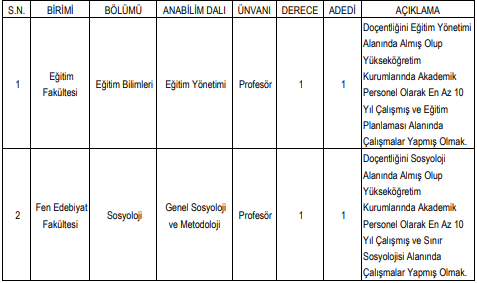Eğitim Fakültesi / Eğitim Yönetimi: Doçentliğini Eğitim Yönetimi alanında almış, yükseköğretimde en az 10 yıl çalışmış, eğitim planlaması alanında çalışmaları bulunan adaylar başvurabilecek.