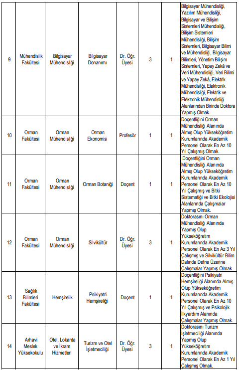Orman Fakültesi / Orman Ekonomisi: En az 10 yıl akademik tecrübeye sahip orman mühendisliği kökenli adaylar alınacak.