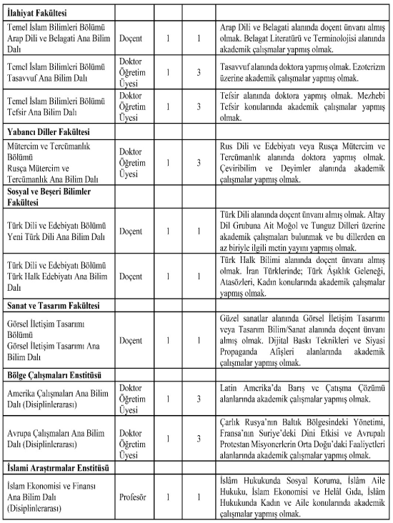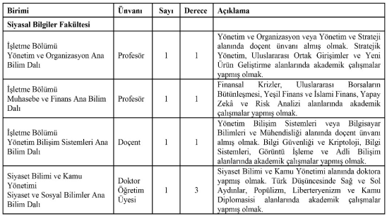 Aynı duyuruda, araştırma görevlisi alımı yapılacağı da belirtildi. 10 sayılı Cumhurbaşkanlığı Kararnamesi ve “Öğretim Üyesi Dışındaki Öğretim Elemanı Kadrolarına Yapılacak Atamalarda Uygulanacak Merkezi Sınav ile Giriş Sınavlarına İlişkin Yönetmelik” hükümlerine göre yürütülecek başvurular da elektronik ortamda kabul edilecek.