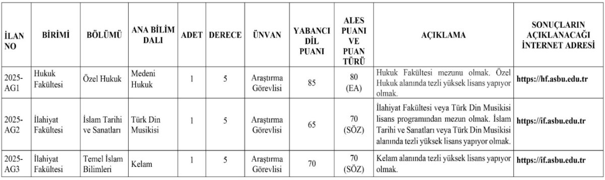 İlana ve başvuru detaylarına http://www.asbu.edu.tr adresinden ulaşılabiliyor.