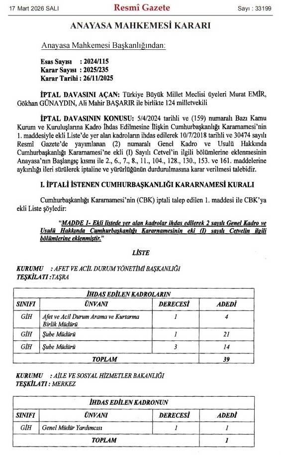 Anayasa Mahkemesi, kamu kurumlarına kadro ihdas edilmesine ilişkin 159 numaralı Cumhurbaşkanlığı Kararnamesi’nin bazı hükümlerini mercek altına aldı. Türkiye Büyük Millet Meclisi üyeleri Murat Emir, Gökhan Günaydın ve Ali Mahir Başarır ile birlikte 124 milletvekilinin açtığı davada, kadro ihdaslarının "kanunla" yapılması gerektiği savunulmuştu.