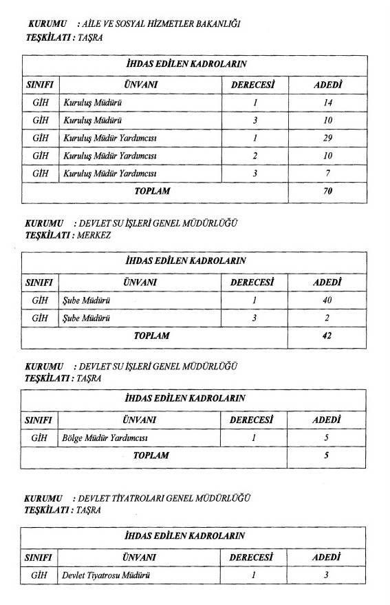 Aile ve Sosyal Hizmetler Bakanlığı: Genel Müdür Yardımcısı ve Kuruluş Müdürü kadroları.