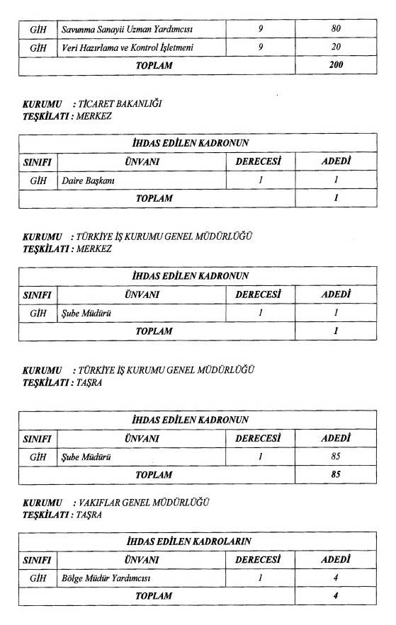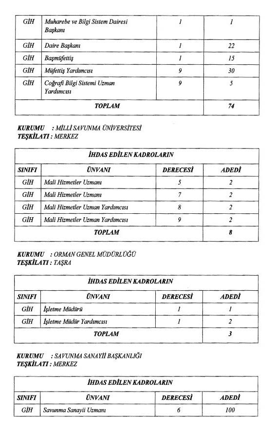 Milli Savunma Bakanlığı: Daire Başkanı, Başmüfettiş ve Müfettiş Yardımcısı kadroları.