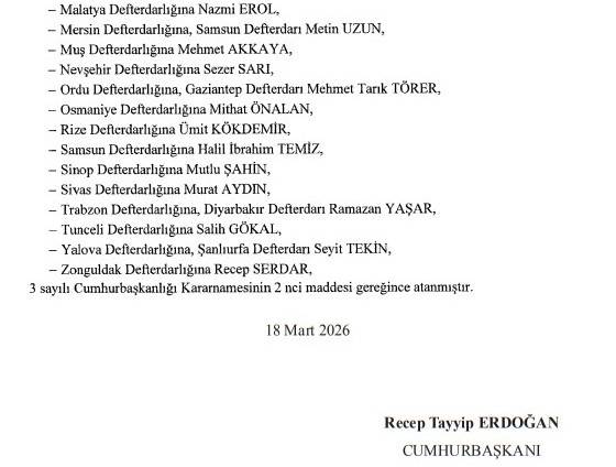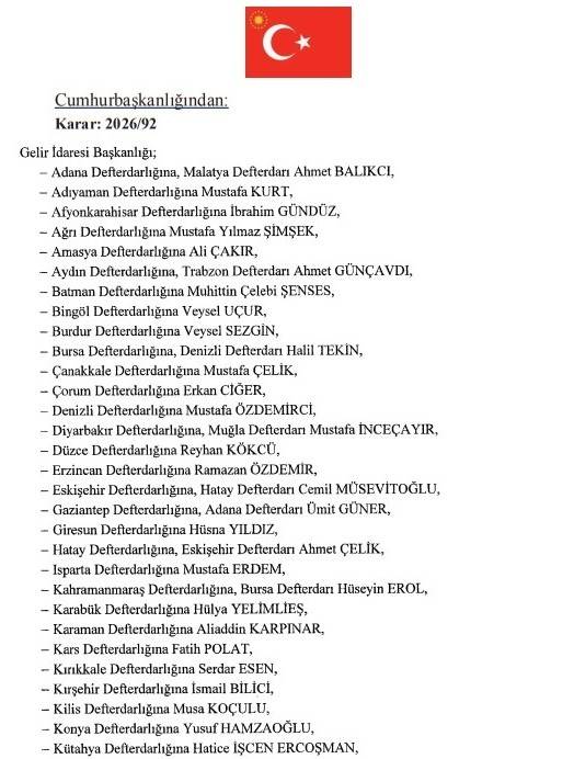 Bu gece yayınlanan (19 Mart 2026) tarihli resmi gazetede yayınlanan Defterdarlar listesinde yeni atamalar da var. İşti o atamaların tam listesi.