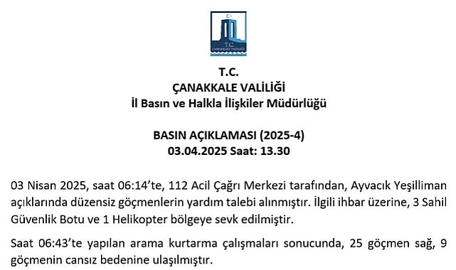 Çanakkale Valiliği'nden yapılan açıklamada; "03 Nisan 2025, saat 06:14'te, 112 Acil Çağrı Merkezi tarafından, Ayvacık Yeşilliman açıklarında düzensiz göçmenlerin yardım talebi alınmıştır. İlgili ihbar üzerine, 3 Sahil Güvenlik Botu ve 1 Helikopter bölgeye sevk edilmiştir.