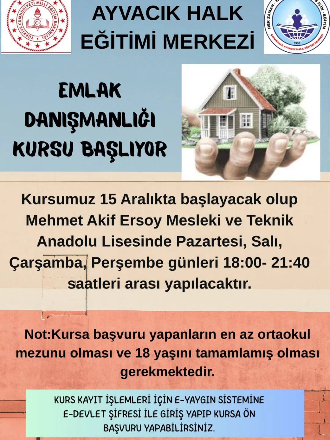 Ayvacık’ta emlak sektörüne adım atmak isteyenler için önemli bir fırsat niteliği taşıyan Emlak Danışmanlığı Kursu, 15 Aralık’ta başlıyor. Kursun adresi olarak Mehmet Akif Ersoy Mesleki ve Teknik Anadolu Lisesi belirlendi.