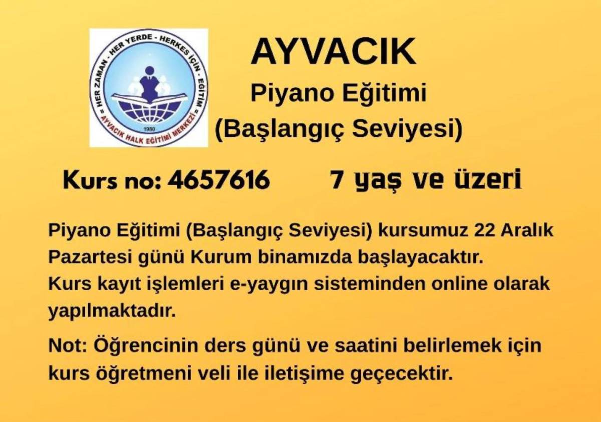 Ayvacık Halk Eğitimi Merkezi, her yaş grubuna yönelik eğitim faaliyetlerine bir yenisini daha ekliyor. Kültür, sanat ve müzik alanında bireylerin gelişimini desteklemeyi amaçlayan merkez, Piyano Eğitimi (Başlangıç Seviyesi) kursunu hayata geçiriyor. Kurs, 22 Aralık Pazartesi günü Ayvacık Halk Eğitimi Merkezi kurum binasında başlayacak.