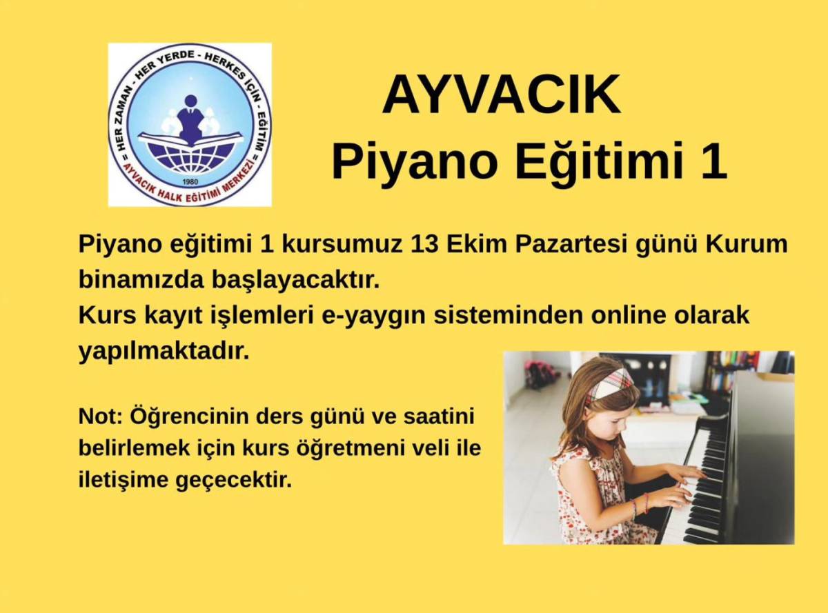 Ayvacık Halk Eğitimi Merkezi bünyesinde açılacak “Piyano Eğitimi 1” kursu, 13 Ekim Pazartesi günü kurum binasında başlayacak. Kurs kayıt işlemleri e-yaygın sistemi üzerinden online olarak yapılabiliyor.
