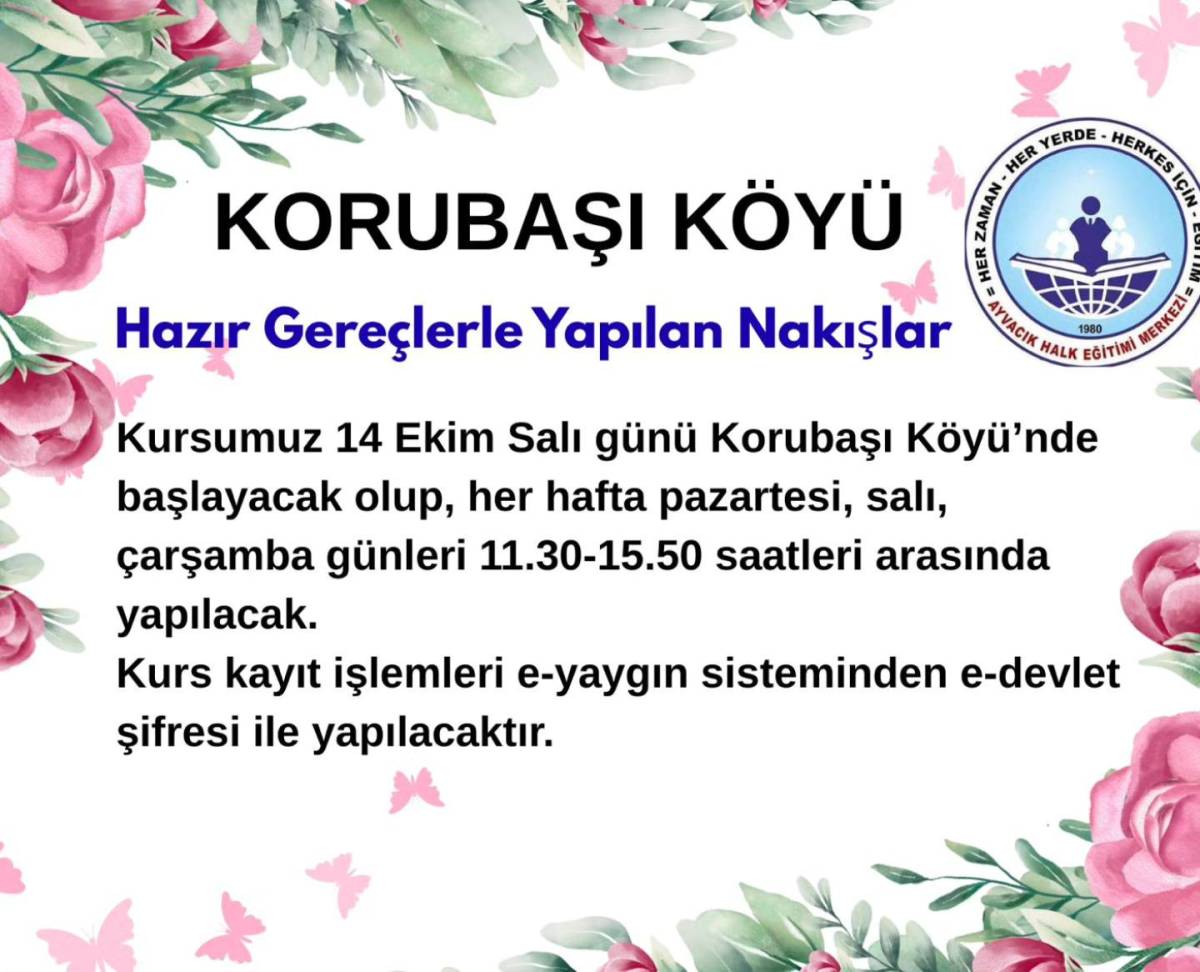 Ayvacık Halk Eğitimi Merkezi tarafından açılacak bir diğer kurs ise “Hazır Gereçlerle Yapılan Nakışlar” olacak. Kurs 14 Ekim Salı günü Korubaşı Köyü’nde başlayacak ve her hafta pazartesi, salı ve çarşamba günleri 11.30-15.50 saatleri arasında gerçekleştirilecek.