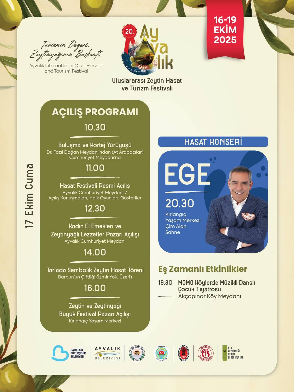 16:00: Zeytin ve Zeytinyağı Büyük Festival Pazarı Kırlangıç Yaşam Merkezi’nde açılacak.
