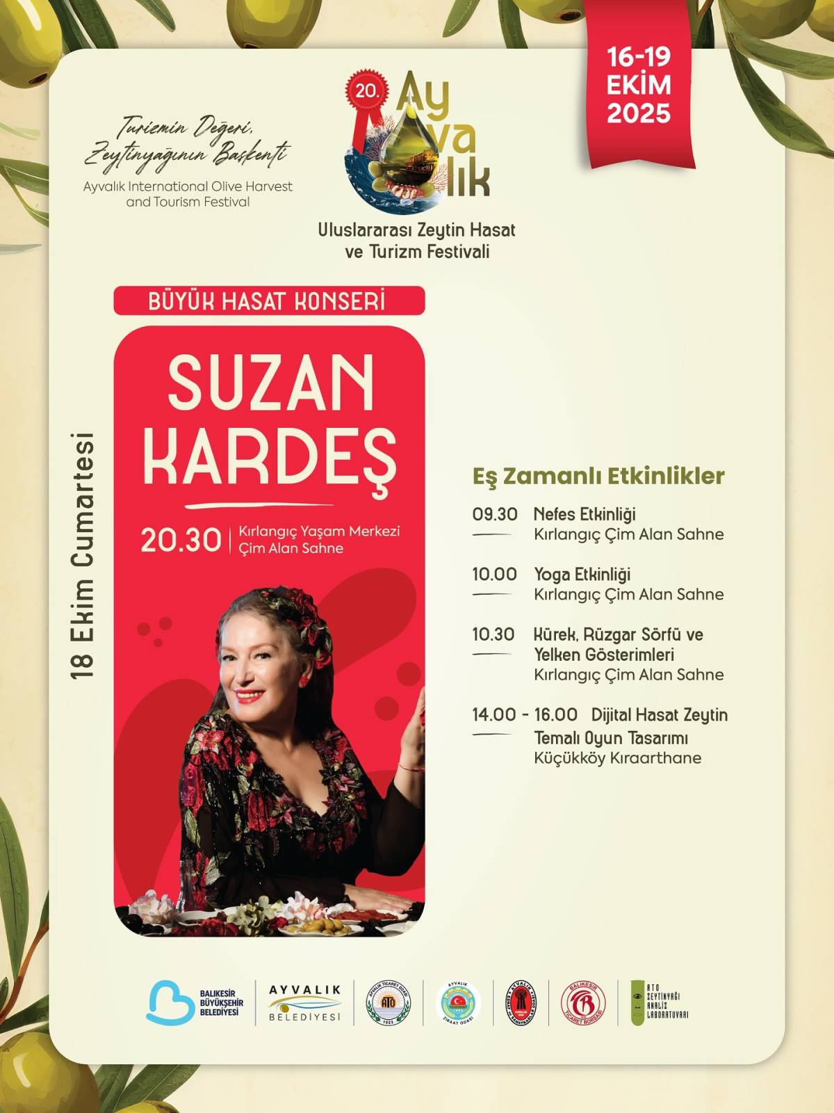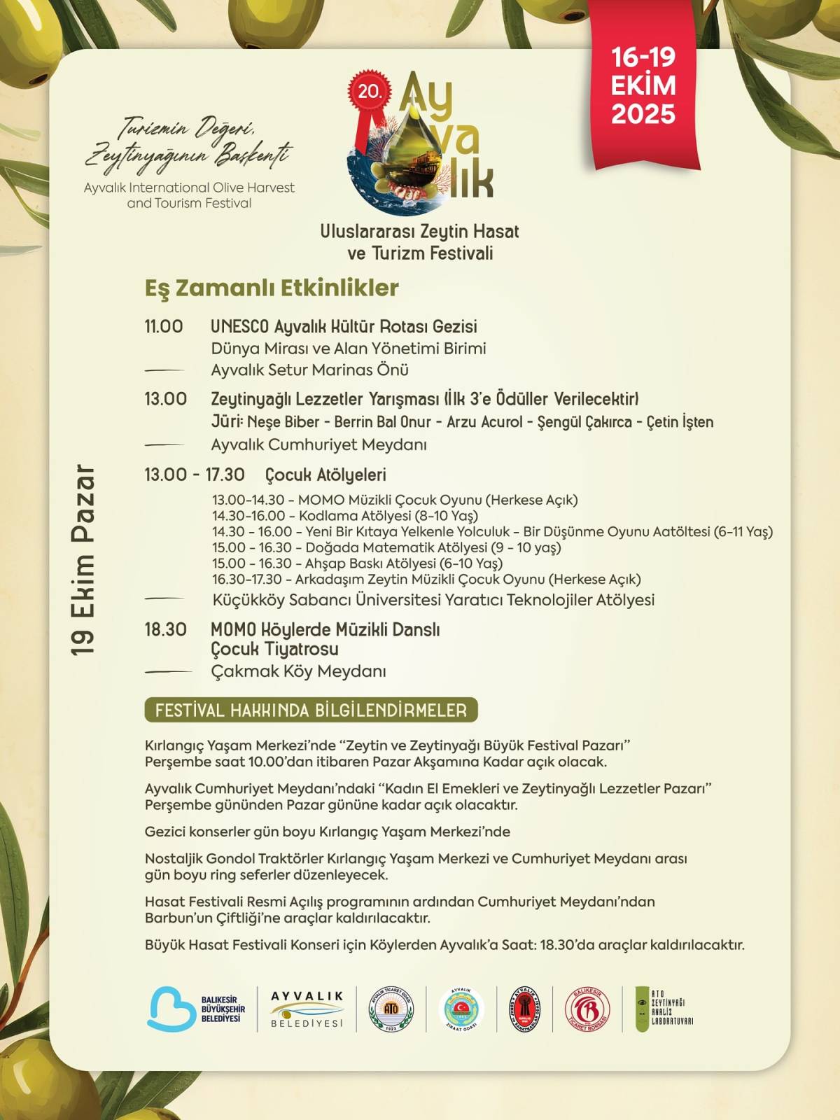 Ayvalık, 16-19 Ekim 2025 tarihleri arasında 20. Uluslararası Ayvalık Zeytin Hasat ve Turizm Festivali ile yeniden zeytin ve zeytinyağı kokulu bir coşkuya ev sahipliği yapacak. Festival, alanında uzman isimler ve Türkiye’nin önde gelen sektör temsilcileriyle, zeytin ve zeytinyağının değerini hem katılımcılara hem de global pazara taşıyacak.