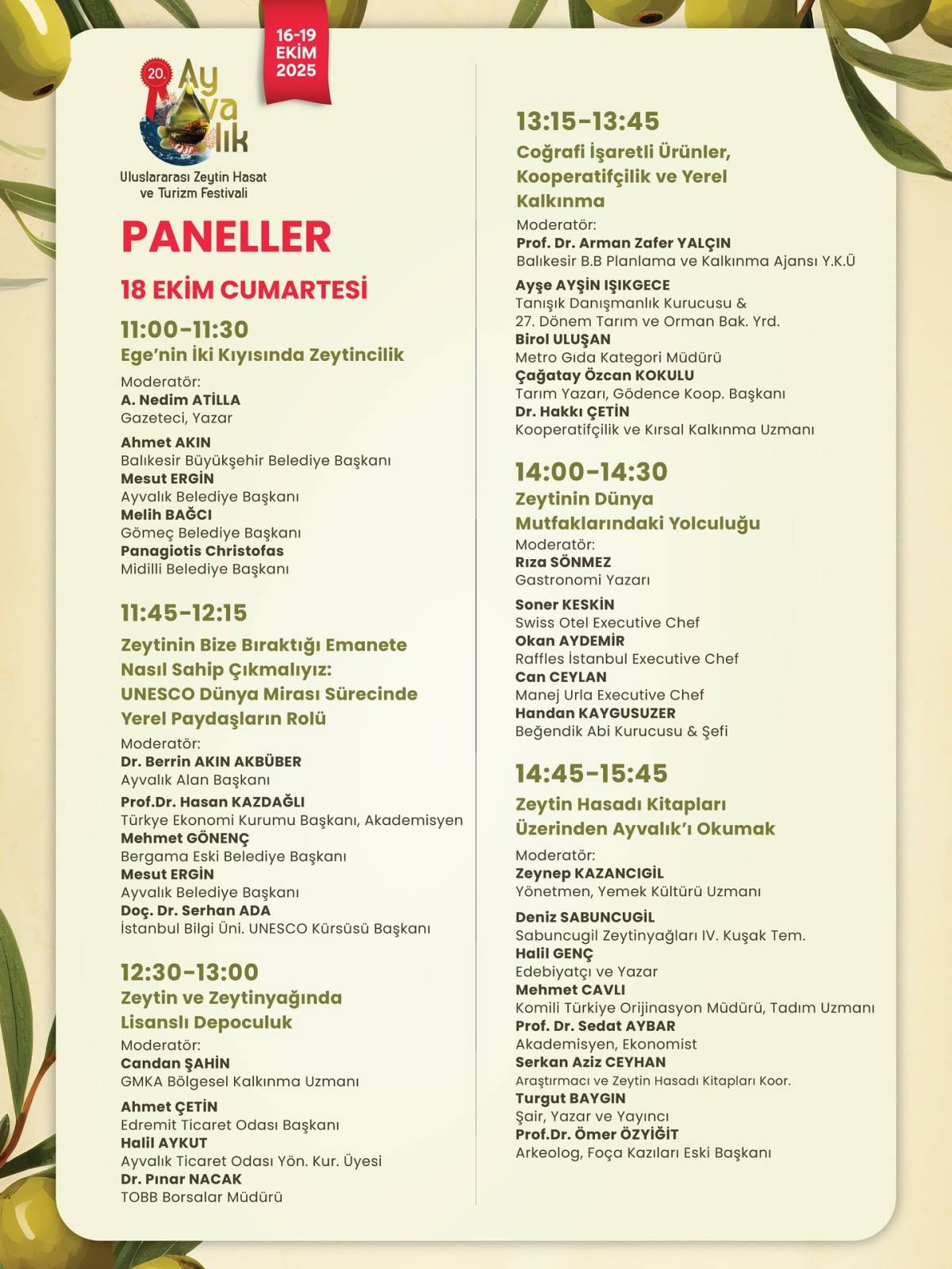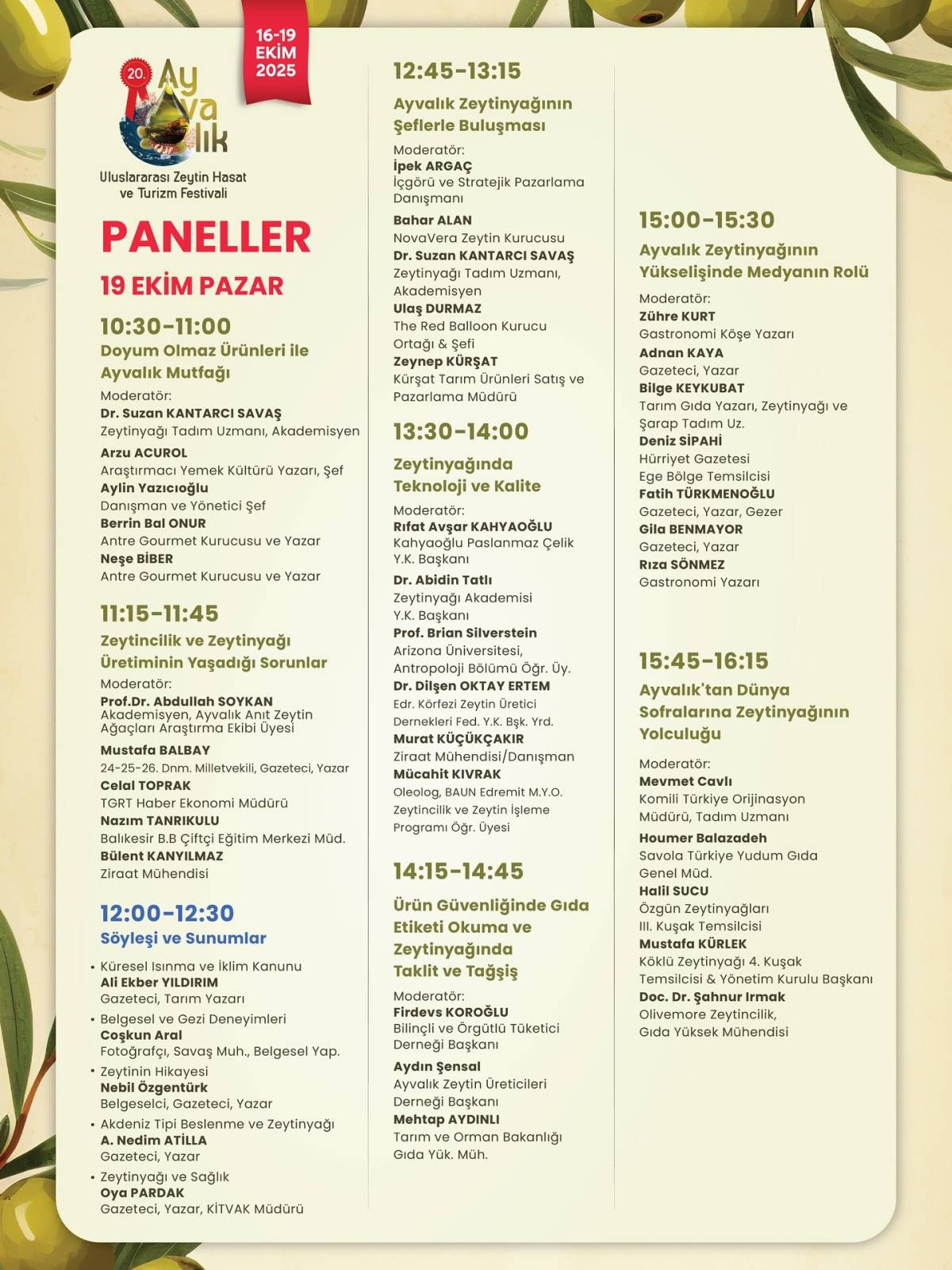 Festival boyunca gerçekleşecek paneller, zeytincilik sektörünün farklı yönlerini ele alacak. 18 Ekim Cumartesi ve 19 Ekim Pazar günleri düzenlenecek panellerde öne çıkan başlıklar şunlar: