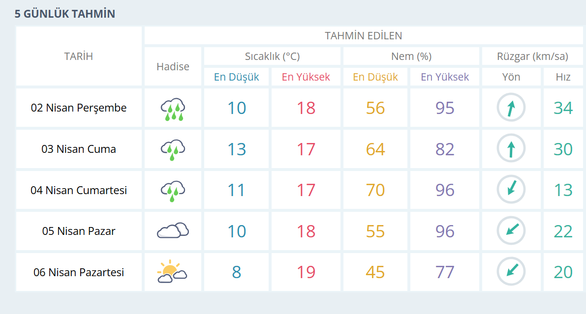 Çanakkale için hazırlanan 5 günlük hava tahmini raporu, sıcaklıkların mevsim normallerinde seyretmesine rağmen yağışın kenti terk etmeyeceğini gösteriyor. 2 Nisan Perşembe günü kentte kuvvetli sağanak yağış beklenirken, en yüksek sıcaklığın 18 derece olması öngörülüyor. Perşembe günü rüzgarın hızı saatte 34 kilometreye kadar çıkarak fırtınanın en sert evrelerinden birini yaşatacak. 3 Nisan Cuma ve 4 Nisan Cumartesi günleri de yağışlı hava etkisini sürdürmeye devam edecek. Bu günlerde termometreler 17 dereceyi gösterecek ve nem oranının yüzde 96'lara kadar çıkmasıyla hissedilen hava daha kapalı ve basık olacak.
