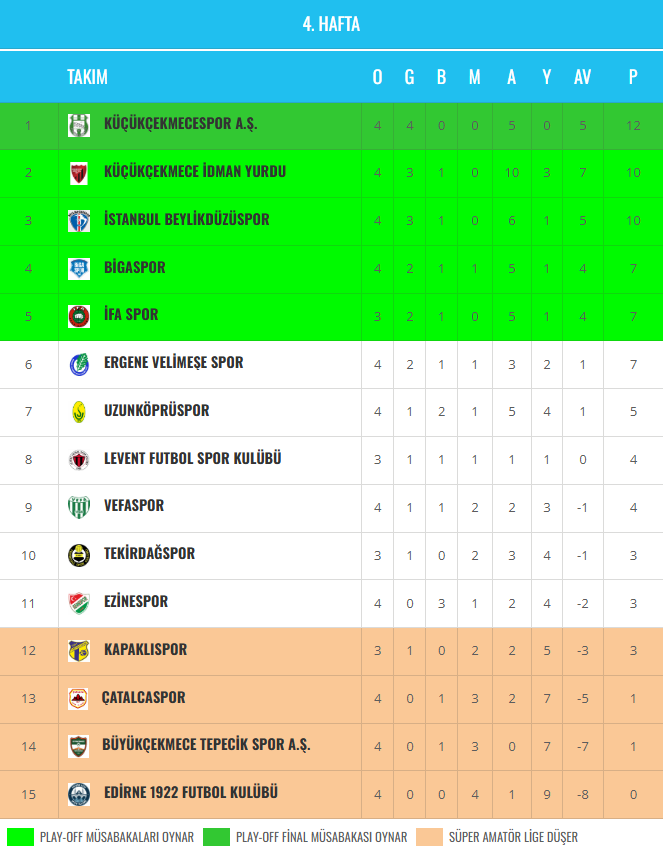 Hafta sonu alınan sonuçların ardından Küçükçekmecespor liderliğini sürdürürken, Küçükçekmece İdman Yurdu ikinci sırada yer aldı. Üçüncü sırada ise İstanbul Beylikdüzüspor bulunuyor.