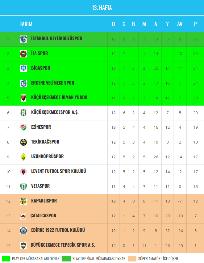 13. hafta maçlarının ardından oluşan puan durumunda ilk üç sıra dikkat çekti. İstanbul Beylikdüzüspor, İFA Spor ve Bigaspor, haftayı üst sıralarda tamamlayan ekipler oldu. Puan tablosunun üst bölgesindeki bu yakınlık, önümüzdeki haftalarda oynanacak maçların önemini bir kat daha artırdı. Takımlar, hem zirve takibini sürdürmek hem de play-off hattından kopmamak için mücadele etmeye devam ediyor. İşte 13. hafta sonunda oluşan puan tablosu;