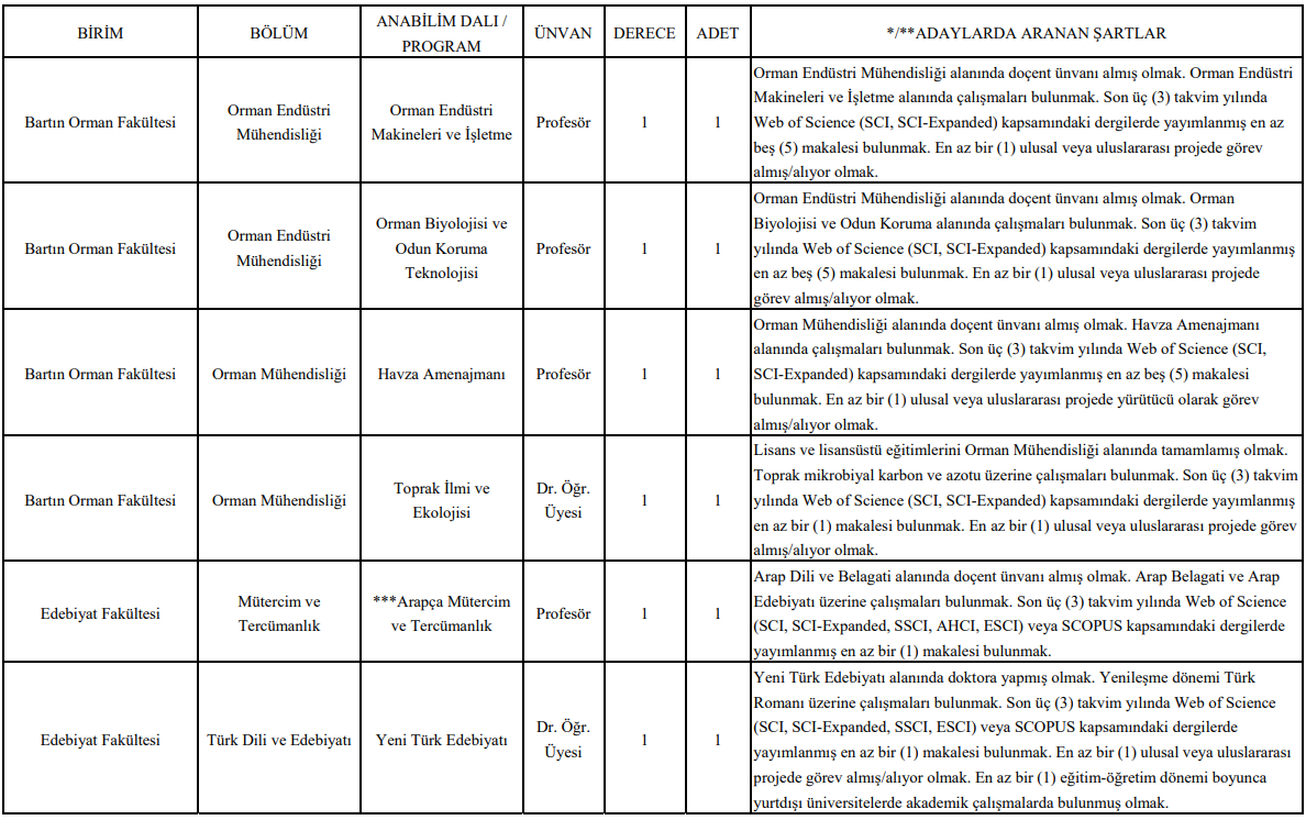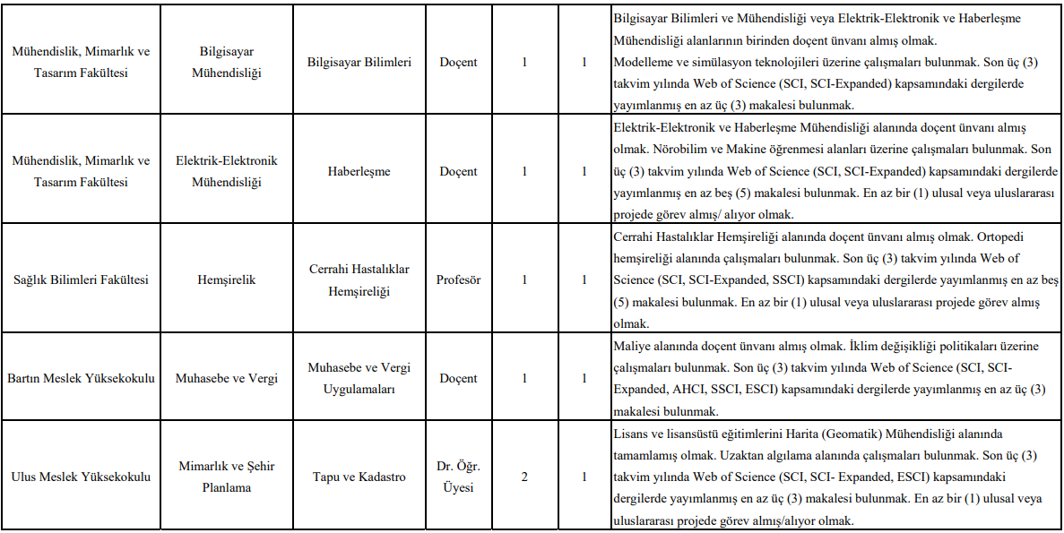 Bartın Üniversitesi tarafından yayımlanan ilana göre alımlar; Orman Fakültesi, Edebiyat Fakültesi, Eğitim Fakültesi, İktisadi ve İdari Bilimler Fakültesi, İlahiyat Fakültesi, Mühendislik, Mimarlık ve Tasarım Fakültesi, Sağlık Bilimleri Fakültesi, Bartın Meslek Yüksekokulu ve Ulus Meslek Yüksekokulu bünyesinde gerçekleştirilecek.
