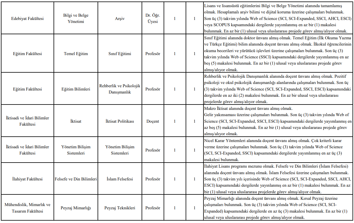 Her bir kadro için özel olarak belirlenen şartlar bulunuyor. Profesör ve doçent kadrolarında, ilgili bilim alanında doçentlik unvanı alınmış olması ve Web of Science veya SCOPUS kapsamındaki dergilerde yayımlanmış belirli sayıda makaleye sahip olunması gerekiyor.