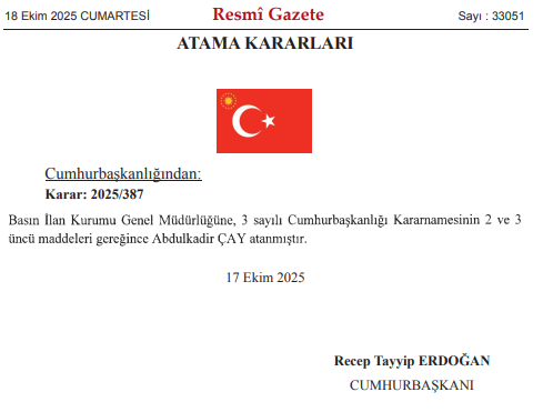 18 Ekim 2025 Cumartesi tarihli ve 33051 sayılı Resmî Gazete’de yayımlanan Cumhurbaşkanlığı atama kararlarına göre, devlet kurumlarında önemli görev değişiklikleri gerçekleştirildi. Cumhurbaşkanı Recep Tayyip Erdoğan’ın imzasını taşıyan kararlarda Basın İlan Kurumu Genel Müdürü değişti.