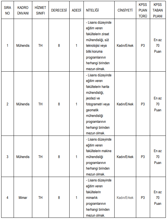 Tüm pozisyonlar için adayların KPSS P3 puan türünden en az 70 puan almış olması ve kadın veya erkek olması şart.
