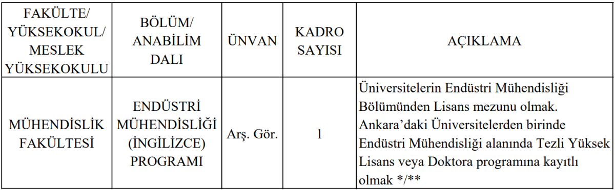 İlan edilen kadro, Mühendislik Fakültesi Endüstri Mühendisliği (İngilizce) programı için açıldı. Araştırma görevlisi kadrosu için yalnızca bir kişi alınacak.