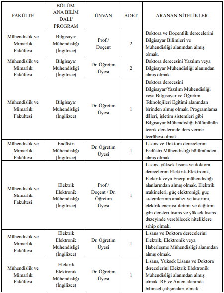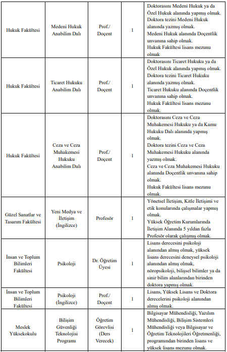 İlanda, Mühendislik ve Mimarlık Fakültesi, Hukuk Fakültesi, Güzel Sanatlar ve Tasarım Fakültesi, İnsan ve Toplum Bilimleri Fakültesi ile Meslek Yüksekokulu başta olmak üzere birçok akademik birime personel alımı yapılacağı bilgisi yer aldı. Bilgisayar Mühendisliği, Endüstri Mühendisliği, Elektrik Elektronik Mühendisliği, Psikoloji, Yeni Medya ve İletişim ile çeşitli hukuk anabilim dalları kadroların açıldığı bölümler arasında bulunuyor.