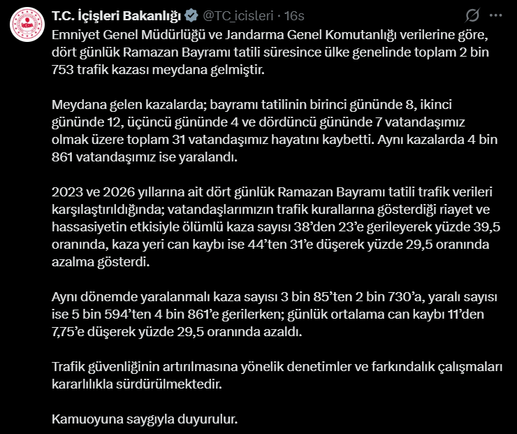 İçişleri Bakanlığı, Ramazan Bayramı tatiline ilişkin trafik verilerini kamuoyuyla paylaştı. Açıklanan resmi rakamlara göre, dört günlük bayram süresince Türkiye genelinde toplam 2 bin 753 trafik kazası meydana geldi. Bu kazalarda 31 kişi hayatını kaybederken, 4 bin 861 kişi de yaralandı.