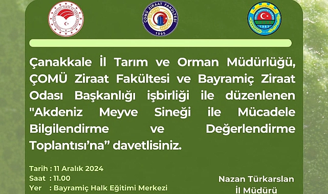 Toplantı, 11 Aralık 2024 Çarşamba günü saat 11.00’de, Bayramiç Halk Eğitimi Merkezi Toplantı Salonu’nda gerçekleşecek. Programda, Akdeniz Meyve Sineği hakkında bir sunum yapılacak ve ardından katılımcılarla soru-cevap bölümü düzenlenecek.