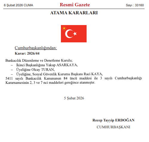 6 Şubat 2026 tarihli ve 33160 sayılı Resmî Gazete’de yayımlanan Cumhurbaşkanlığı Atama Kararları kapsamında Bankacılık Düzenleme ve Denetleme Kurulu’nun (BDDK) yönetim kadrosunda değişikliğe gidildi. 2026/44 sayılı karara göre Yakup Asarkaya Kurul İkinci Başkanlığına atanırken, Olcay Turan ile Sosyal Güvenlik Kurumu Başkanı Raci Kaya kurul üyeliğine getirildi. Atamalar, 5411 sayılı Bankacılık Kanunu’nun 84’üncü maddesi ile 3 sayılı Cumhurbaşkanlığı Kararnamesi hükümleri çerçevesinde gerçekleştirildi.
