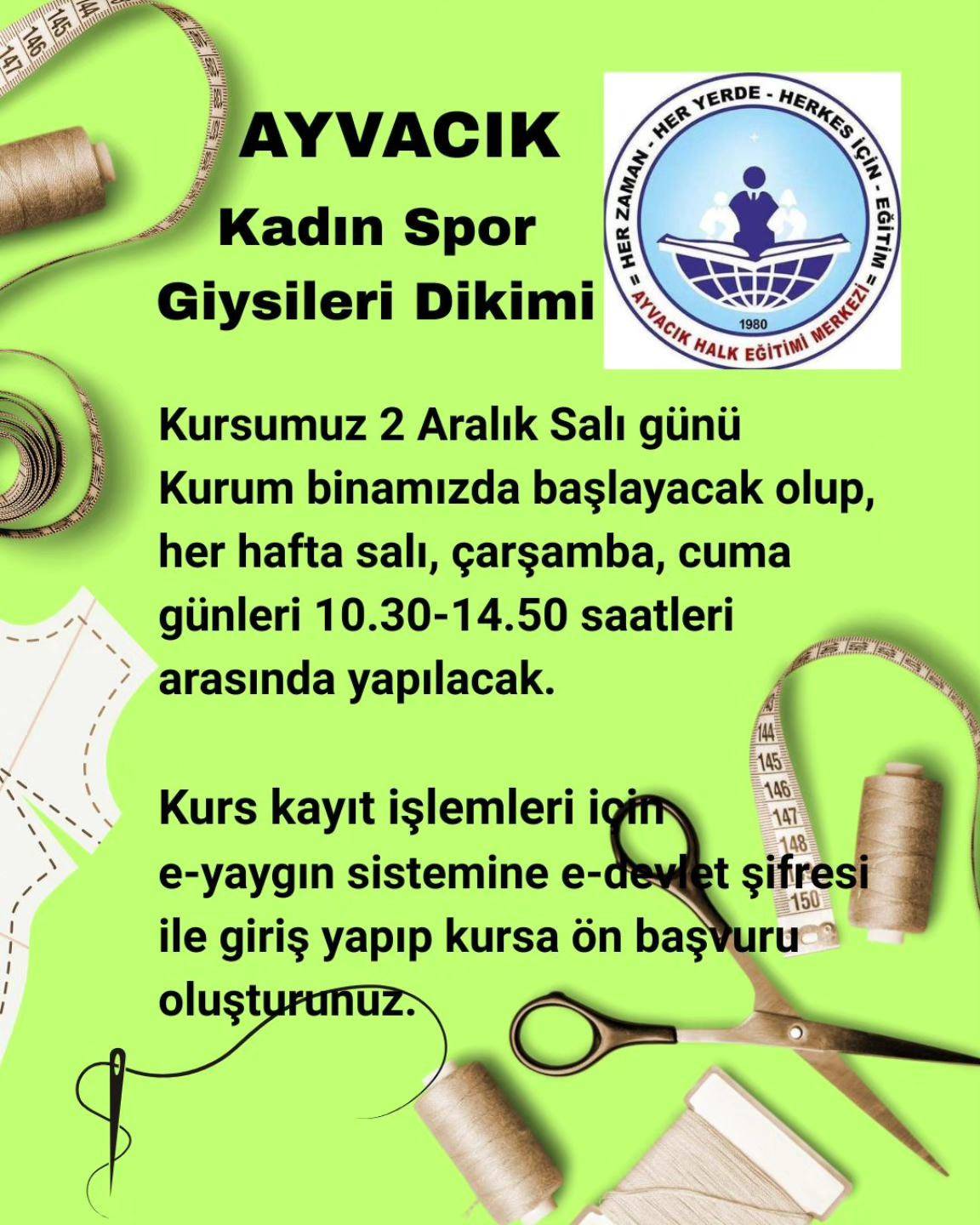 Ayvacık’ta düzenlenecek kursun başlangıç tarihi 2 Aralık Salı günü olarak açıklandı. Kurum binasında gerçekleştirilecek olan eğitimlerin haftanın belirli günlerinde devam edeceği duyuruldu. Kurs, salı, çarşamba ve cuma günleri 10.30 ile 14.50 saatleri arasında yapılacak. Toplamda geniş kapsamlı bir eğitim süreci planlanan kursta kadın spor giysilerinin kalıp hazırlama, ölçü alma, dikim teknikleri ve bitiş işlemleri gibi tüm aşamalar detaylı şekilde işlenecek.