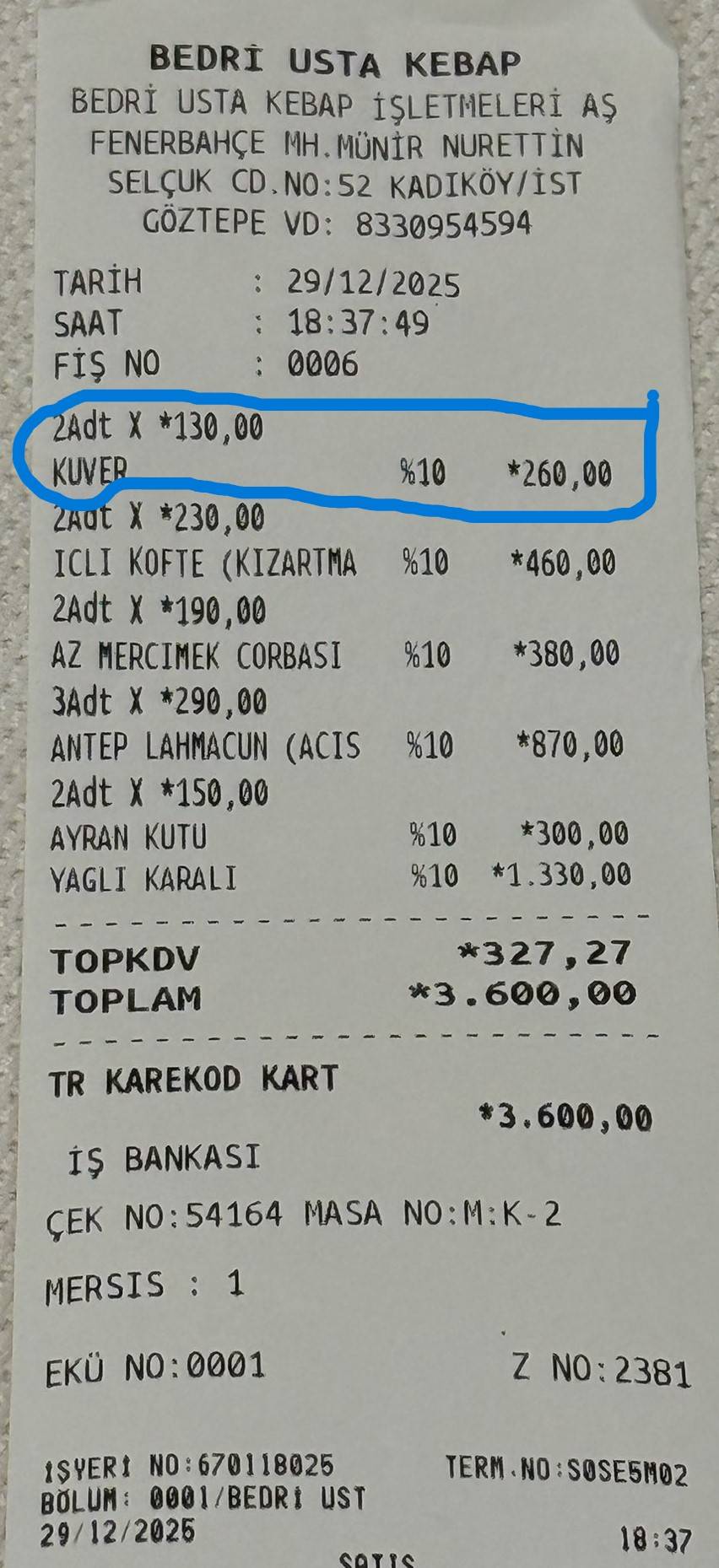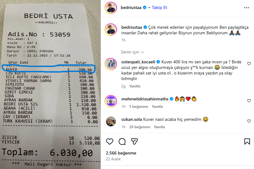 Bur görsel Bedri Ustanın kendi sosyal medyasından paylaşılmış ve burada da alınması, adisyona yaz ılması hesaba eklenmesi yasal olmayan Kuver ücretini görüyoruz.