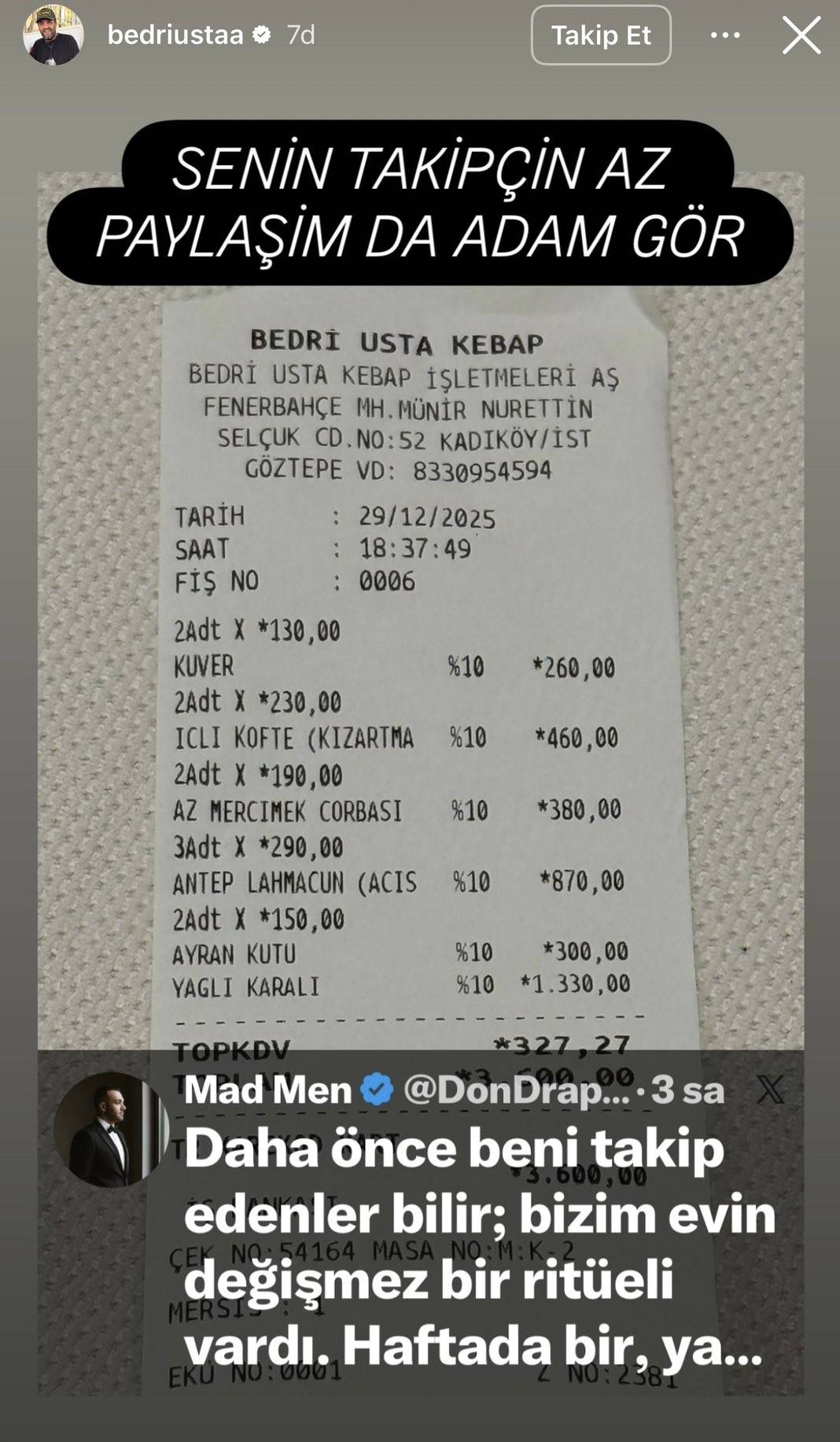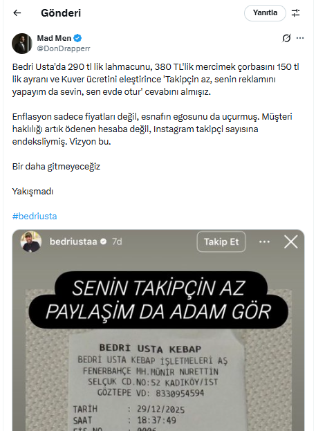 Fahiş fiyatlar ve haksız kuver ücreti kadar, markanın kurucusu Bedri Usta'nın eleştirilere verdiği yanıtlar da tepki çekiyor. Bir sosyal medya kullanıcısının, restorandaki fiyat politikasını ve haksız ücretlendirmeyi eleştirmesi üzerine Bedri Usta'nın verdiği, "Senin takipçin az, paylaşım de adam gör" şeklindeki üst perdeden yanıtı, bardağı taşıran son damla oldu.