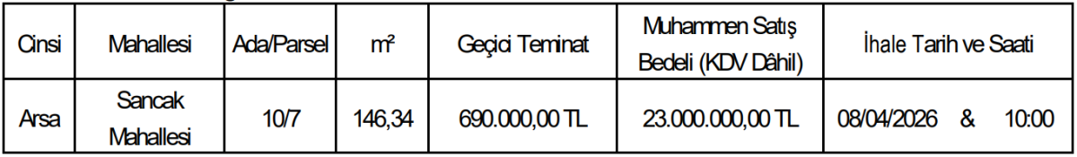 Satış işlemi, 2886 sayılı Devlet İhale Kanunu kapsamında kapalı teklif usulüyle gerçekleştirilecek. İhale, 8 Nisan 2026 tarihinde saat 10.00’da belediye encümen salonunda yapılacak.