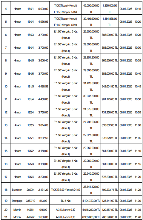 Taşınmaz satış ihaleleri 6 Ocak 2026 Salı günü, sabah saatlerinden itibaren sıra numarasına göre gerçekleştirilecek. İlk ihale saat 10.00’da başlayacak, son ihale ise 11.40’ta yapılacak.