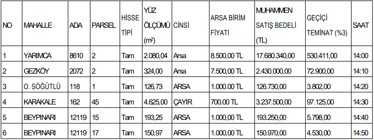 En yüksek geçici teminat bedeli 530.411 TL ile Yarımca Mahallesi’ndeki arsa için belirlendi.