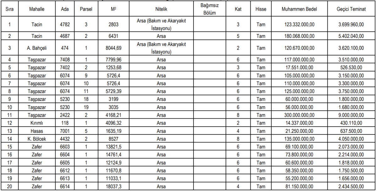 İlan edilen arsalar arasında bakım ve akaryakıt istasyonu yapılabilecek alanlar, konut ve ticaret arsaları ile sanayi alanları da bulunuyor.