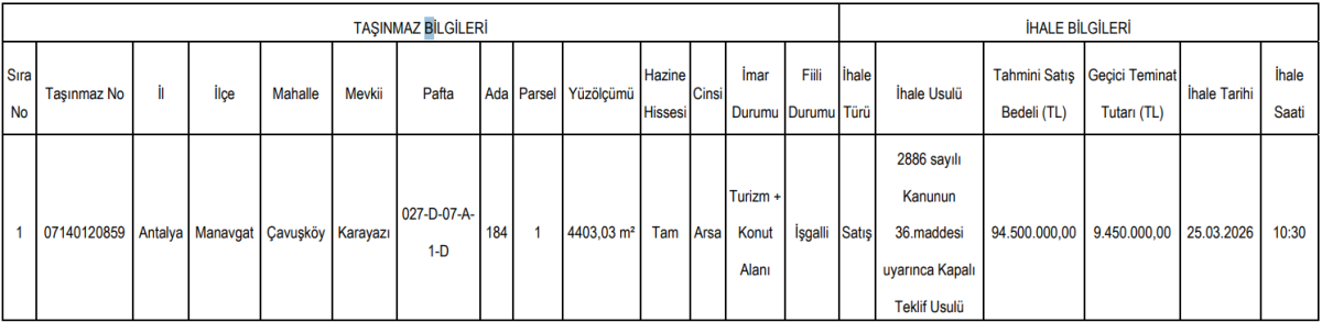 Turizm ve konut alanı imarına sahip taşınmazın ihalesi 25 Mart 2026 tarihinde kapalı teklif usulüyle yapılacak.